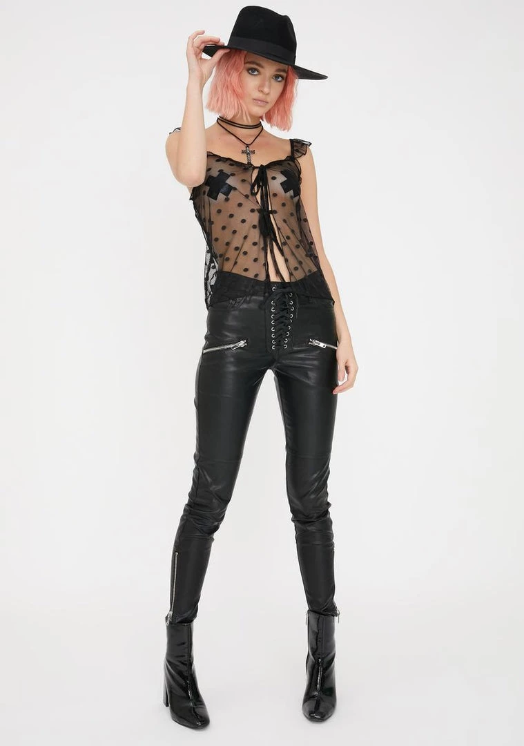 Γ’ΒΒnow that I have your attentionΓ’ΒΒ. Get what you want in this hawt lil mesh top that has supa flirty ruffle straps, front tie closures NΓ’ΒΒ polka dot print all ova.