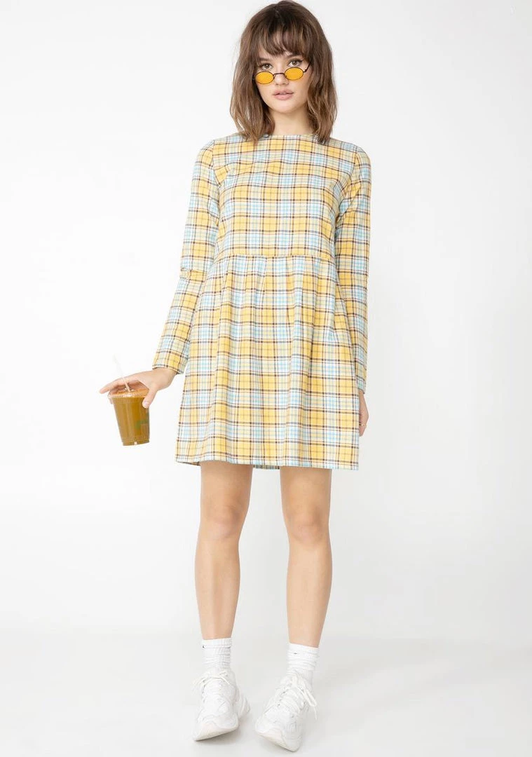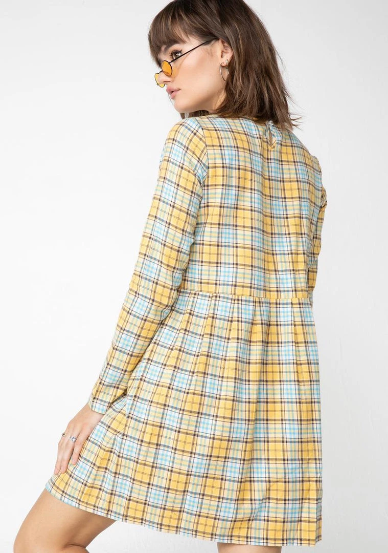 cuz you always keep it cute! Stay charming in this plaid mini dress that has long sleeves, button closures on the back N’ an elastic waistband.