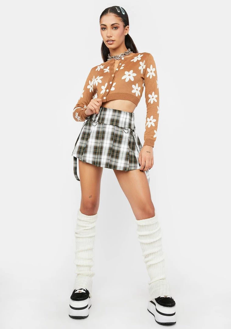 features a knit construction, a floral print all over, front button down closures, ribbed trim, and a cropped hem.