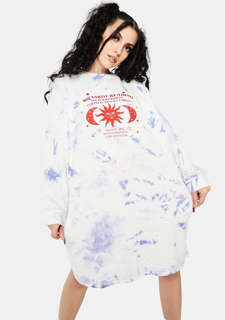has a tie dye print all over, a graphic celestial tarot print across the chest, and a relaxed fit.