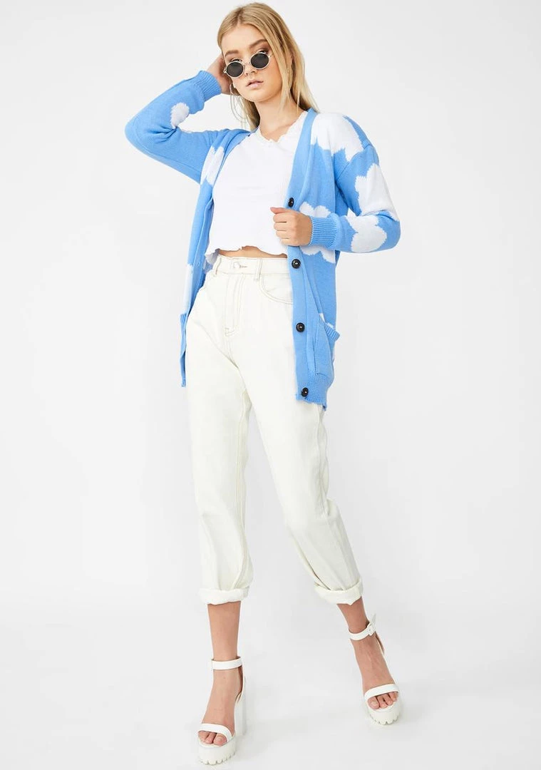 got ya makin’ shapes in the sky. Daydream foreva in this supa dope knit cardigan that has clouds all ova, ribbed trim and button-up closures.