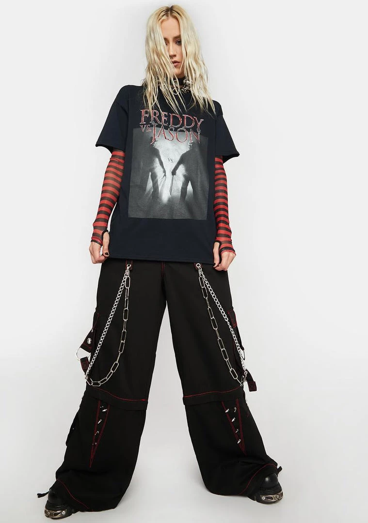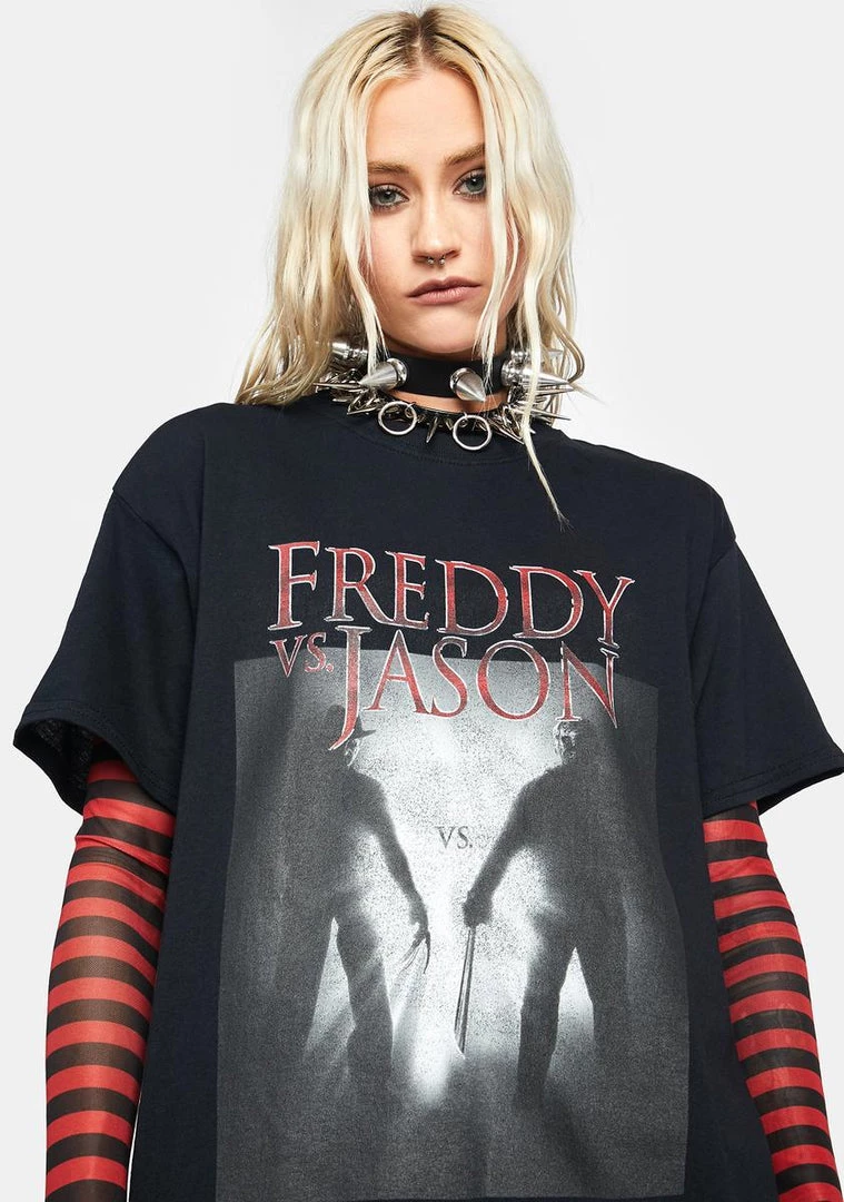 has short sleeves, an oversized fit, a Freddy Vs. Jason film graphic, and “Freddy Vs. Jason” printed on the front.