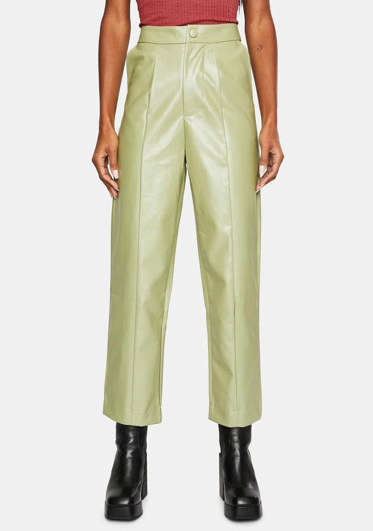 cuz ur the bossiest baddie. These faux leather trousers have a high waist, straight leg cut, front leg seams, and a front button and fly closure.
