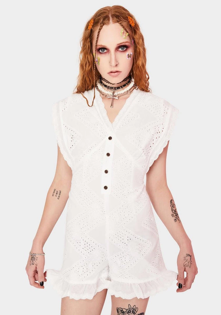 cuz you always keep it cute, babe! This easy breezy playsuit features an eyelet lace construction, mesh ruffle hems, and a button down front.