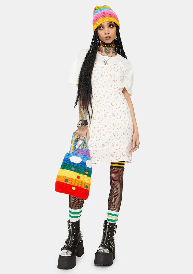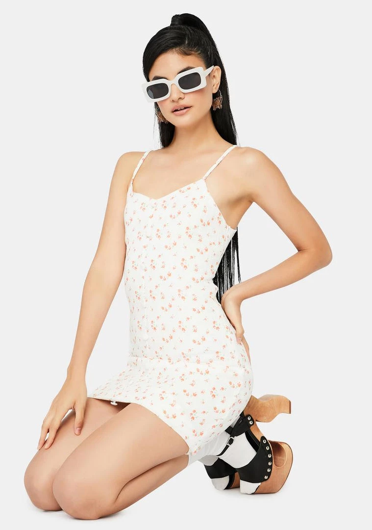 you flower, you feast. This sweet floral mini dress has adjustable straps and a button up front.