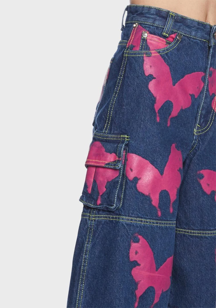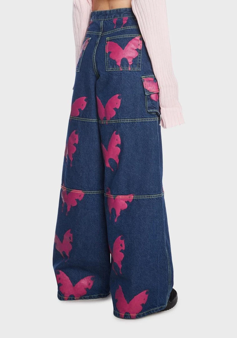 cuz u don’t play games. These jeans have a denim construction, a low rise fit, a wide leg silhouette, a butterfly print on the front and back, front and back pockets, side pockets, and a front button and zip closure.