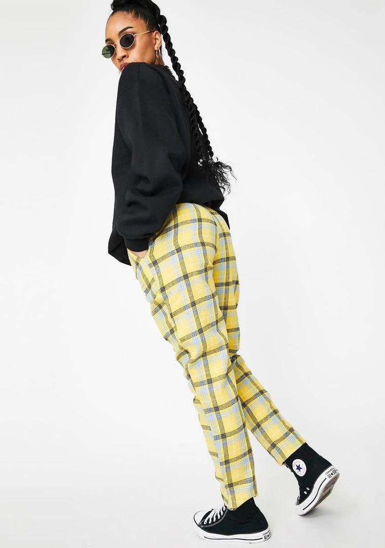 whatΓ’ΒΒs the 411, bb? Kick it in these rad straight leg pants that have a dope plaid print, high waisted fit, and front zip closure.