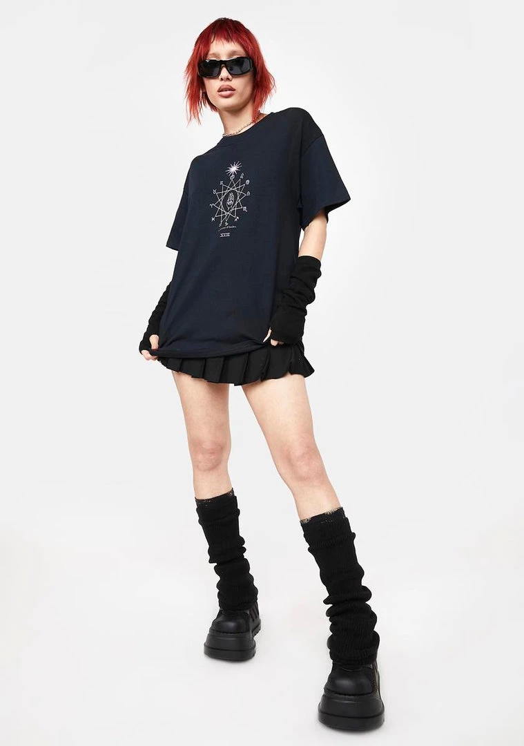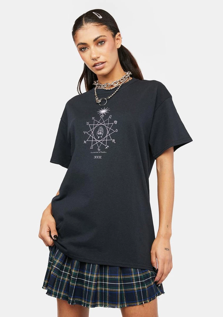 features an oversized fit and a celestial zodiac graphic print across the front.